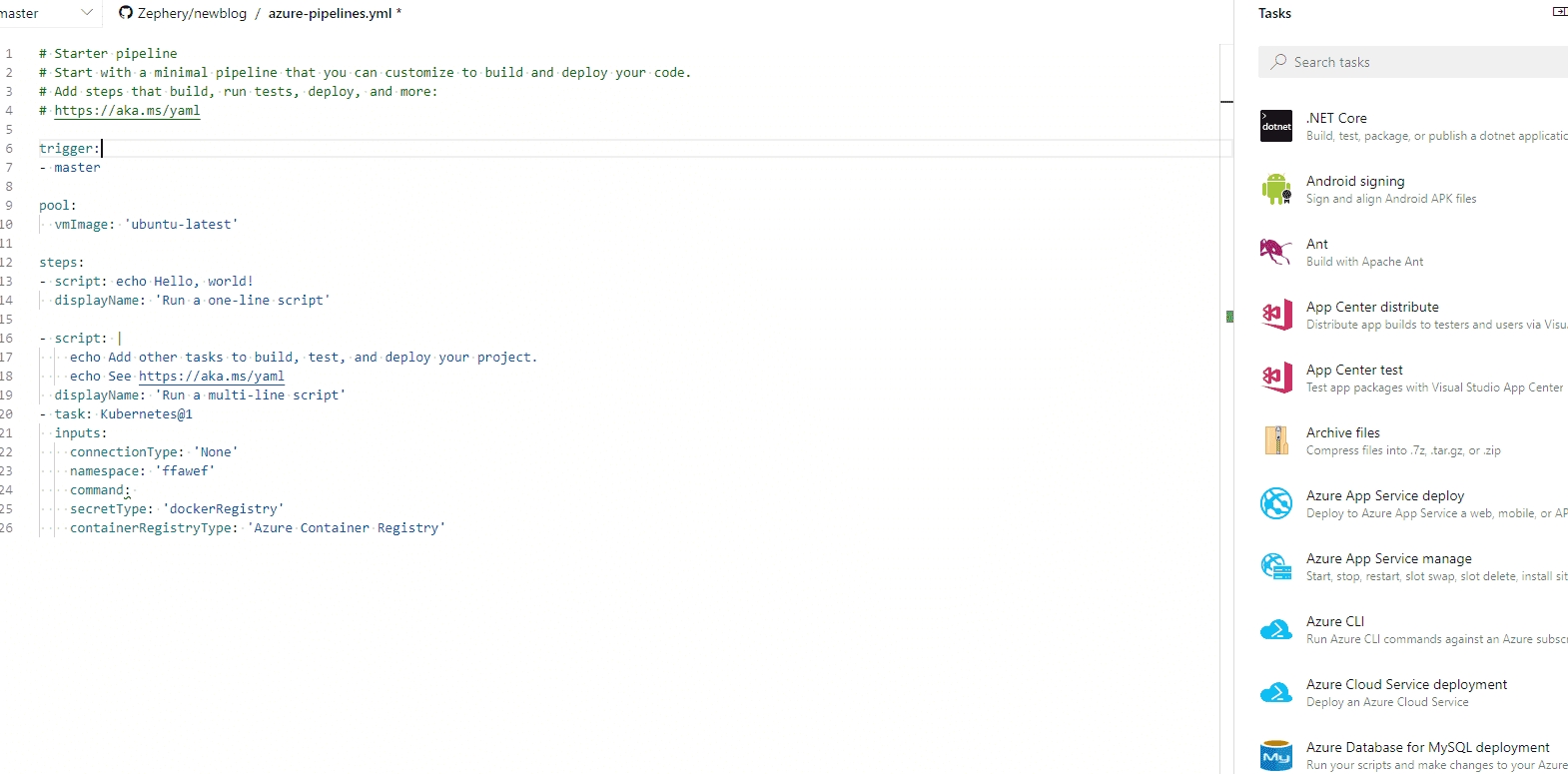 微软Pipeline 微软也是提供了DevOps解决方案的,也是提供了yaml格式的写法,即:在右边填写完之后会转化成yaml。如果想把DevOps打造成一款产品,这样的设计显然不是最好的。