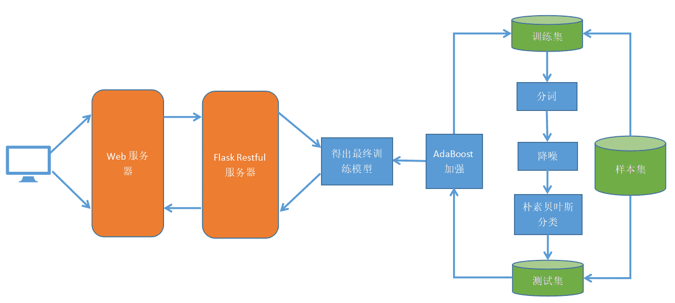 本人大学里的毕业设计就是基于AdaBoost算法的情感分类,学到的东西还是要经常拿出来看看,要不然真的浪费了我这么久努力做的毕业设计啊。构建了一个基本的情感分类小系统,每天抓取微博进行分类存储在MySql上,并使用flask提供Restful API给java调用,可以点击这里尝试(请忽略Google的图片)。目前分类效果不是很明显,准确率大概只有百分之70%,因为训练样本只有500条(找不到训练样本),机器学习真的太依赖样本的标注。这个,只能请教各位路人大神指导指导了。
