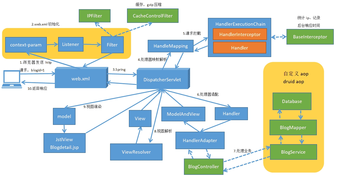 网站核心主要采用Spring SpringMVC和Mybatis,下图是当访问一篇博客的时候的运行流程,参考了张开涛的博客。