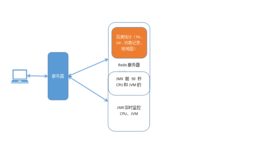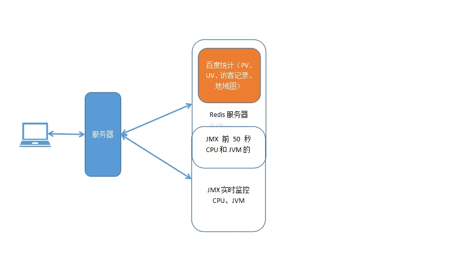 日志系统曾经尝试采用过ELK,实时监控实在是让人不能不称赞,本地也跑起来了,但是一到服务器,卡卡卡,毕竟(1Ghz CPU、1G内存),只能放弃ELK,采用百度统计。百度统计提供了Tongji API供开发者使用,只是有次数限制,2000/日,实时的话实在有点低,只能统计前几天的PV、UV等开放出来。其实这个存放在mysql也行,不过这些零碎的数据还是放在redis中,方便管理。 出了日志系统,自己对服务器的一些使用率也是挺关心的,毕竟服务器配置太低,于是利用了使用了tomcat的JMX来对CPU和jvm使用情况进行监控,这两个都是实时的。出了这两个,对内存的分配做了监控,Eden、Survivor、Tenured的使用情况。