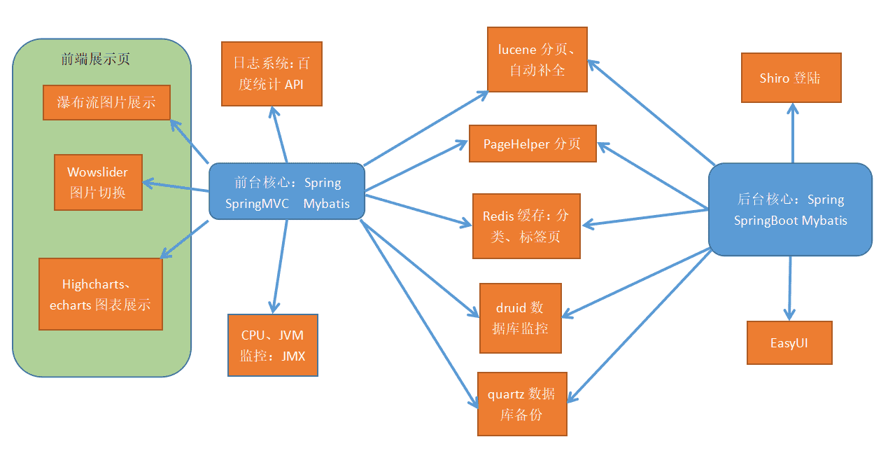 由原本的ssh变成ssm,再变成ssm+shiro+lucene,到现在的前后台分离。前台使用ssm+lucene,后台使用spring boot+shiro。其中,使用pagehelper作为分页,lucene用来搜索和自动补全,使用百度统计的API做了个日志系统,统计pv和uv什么的,同时,还有使用了JMX来观察JVM的使用和cpu的使用率,机器学习方面,使用了adaboost和朴素贝叶斯对微博进行分类,有兴趣的可以点点有点意思这个页面。 本文从下面这几个方面来讲讲网站的建立:
