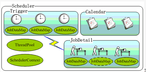 Calendar:org.quartz.Calendar和java.util.Calendar不同,它是一些日历特定时间点的集合(可以简单地将org.quartz.Calendar看作java.util.Calendar的集合——java.util.Calendar代表一个日历时间点,无特殊说明后面的Calendar即指org.quartz.Calendar)。