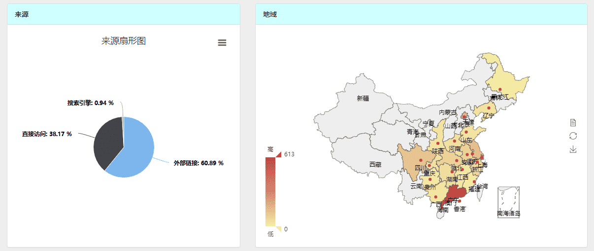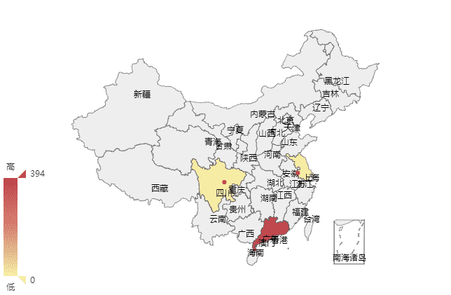 地域图目前支持最好的还是百度的echarts,使用方法见echarts的官网吧,这里不再阐述,展示地域图的时候需要获取下载两个文件,china.js(其提供了js和json,这里使用的js),echarts.js。 部分代码: