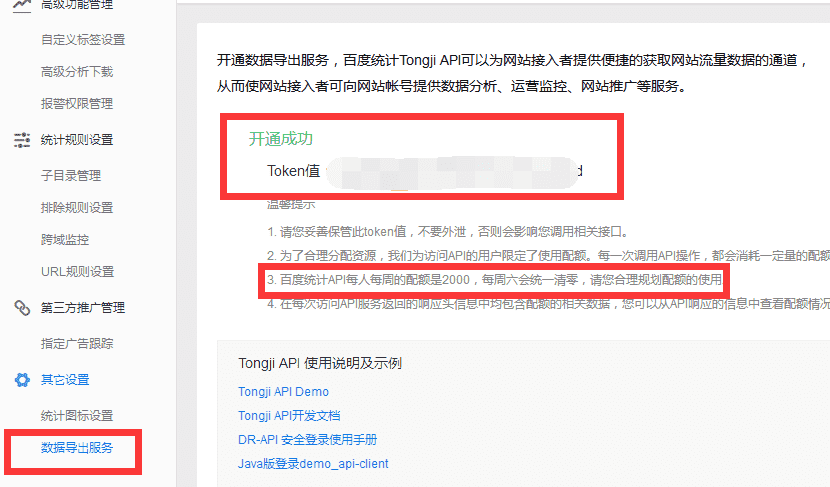 同时,需要在申请其他设置->数据导出服务中开通数据导出服务,百度统计Tongji API可以为网站接入者提供便捷的获取网站流量数据的通道。